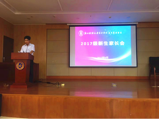 2017年9月16日下午14点,工商管理分院2017级新生家长会在学术中心一号报告厅举行。分院院长刘中文、副院长陈佳骊、各系主任、新生班主任、新生辅导员、和行政老师代表出席了本次家长会,会议由党总支书记费松天主持。