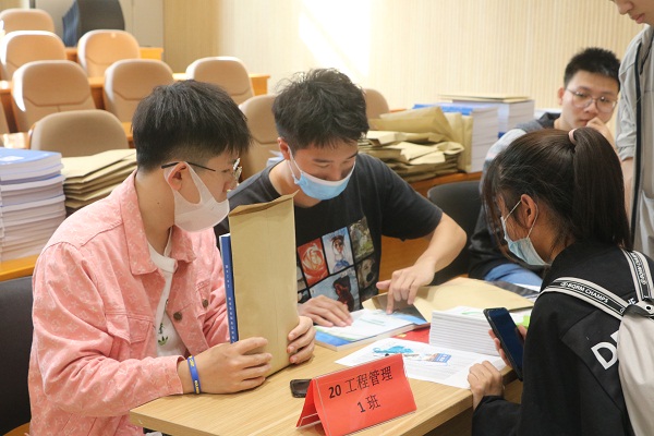 在迎新现场,分发学生手册,安全须知,校园卡等重要物品;报到验证、签到注册等环节井井有条。工作人员认真地为新生办理入学手续,解答各种疑惑,到处是一派迎新的繁忙景象;志愿者们热心的帮新生们搬运行李,欢迎每一位新生的到来。从报名处到注册处,再到寝室,处处涌动着他们忙碌的身影,拉行李箱、搬被褥,忙的不亦乐乎。一张张热情的笑脸,一句句亲切的问候,一项项贴心的服务,欢迎着来自祖国各地的莘莘学子。