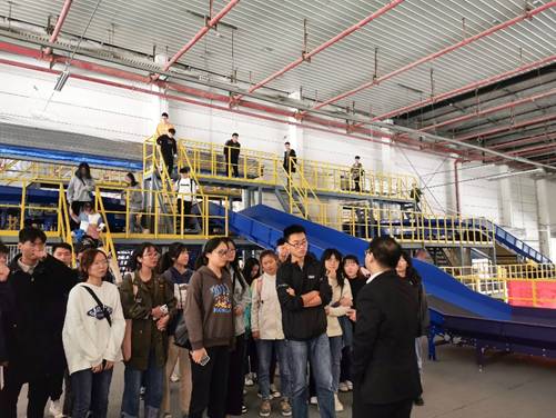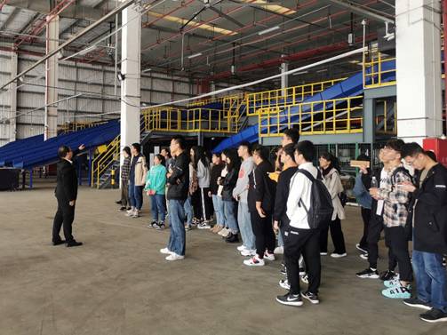 交谈会后,胡经理带师生一行人参观了嘉兴德邦快递的地方区域物件处理处、补货区等工作场所。其中,令学生印象深刻的是自动分拣设备,该套设备是德邦快递应对今年双十一的“秘密武器”。面对原本只存在于书本上的各式各样的物流设备,大家纷纷拿出手机进行拍摄,认真地听着胡经理的介绍。