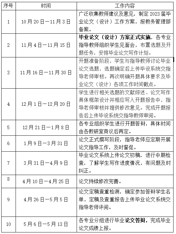 4.学生完成毕业论文工作后,各系应对毕业论文工作认真总结,总结要包括选题分析(性质、难度、分量、综合训练等)、成绩分析等,并于2023年5月13日前将总结报告报送学院教学办公室。