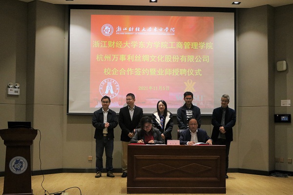 11月5日,1946伟德国际源自英国与杭州万事利丝绸文化股份有限公司举行校企合作签约暨业界导师聘任仪式。杭州万事利公司总经理助理沈小华女士、管理中心副总监唐婵娟女士、销售总监付泽伟女士,东方学院党委副书记吴翼泽,1946伟德国际源自英国院长陈晓阳、党总支书记余健、党总支副书记宣刚、副院长周航以及1946伟德国际源自英国相关系主任、教师代表、学生代表70余人参加活动。