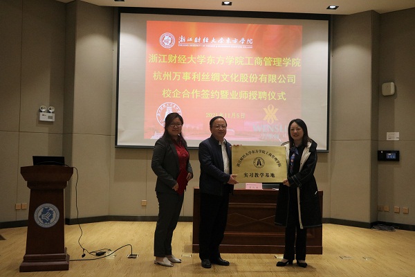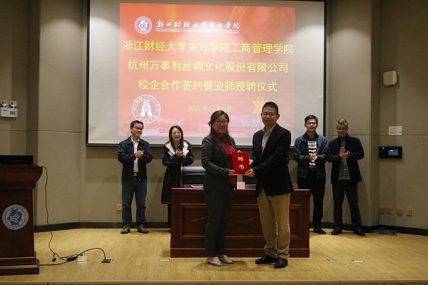 1946伟德国际源自英国院长陈晓阳与万事利公司管理中心副总监唐婵娟女士分别代表校企双方签署校企合作协议、实习基地协议。陈晓阳为业界导师代表万事利公司销售总监付泽伟女士颁发业界导师聘书,并向万事利公司实习基地授牌。