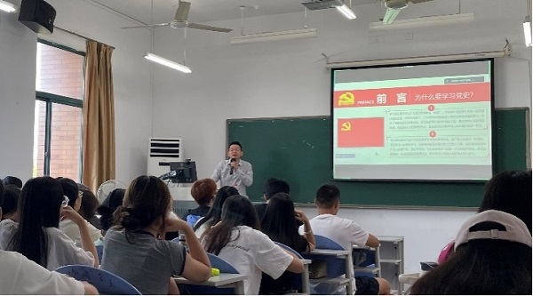 余健首先抛出“为什么要学习党史?”这一问题让新生们思考,接着以“新民主主义革命”、“社会主义革命和建设”、“改革开放和社会主义现代化建设”这三个重要历史时期为切入点为新生们解答这一疑问,巧妙地向新生们讲述了党史学习的重要性,并通过学习党史进一步坚定我们的道路自信、理论自信和制度自信。余健指出要不忘历史,学习历史并做到以史为鉴,加强对党史和国史的学习,铭记中国共产党和中国的苦难辉煌的历程,努力凝聚实现中国梦的强大力量。