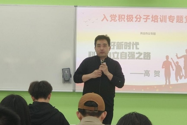 高贺老师结合同学们的发展情况,从“为什么要入党?”出发,引出“走好新时代科技自立自强之路”,并分“新时代”“科技”“自强自立”三点进行详细阐述。高老师分享了新时代科技发展的最新动态和趋势,当前科技已成为推动社会发展的主要动力之一,新兴科技如人工智能、ChatGPT等正在深刻改变着我们的生活和工作方式。他强调,新时代科技自立自强精神的现实落地离不开效率,青年学生应坚持见贤思齐、精进努力,进而成为优秀的党员。最后,高贺希望同学们能向自己的远大理想前进,密切关注科技前沿,不断提升自己的科技素养,勇于探索创新,做到“走在科技发展的前沿,引领时代潮流”。