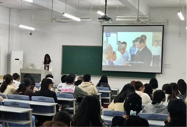 接着,金露同学和同学们观看了习近平总书记在清华大学考察时的视频。习近平总书记告诉同学们“要珍惜这个时代、担负时代使命,在担当中历练,在尽责中成长,让青春在新时代改革开放的广阔天地中绽放,让人生在实现中国梦的奋进追逐中展现出勇敢奔跑的英姿,努力成为德智体美劳全面发展的社会主义建设者和接班人。”最后,金露同学号召大家主动学习习近平总书记的讲话精神,并表示作为当代大学生及入党积极分子,要肩负起历史使命,坚定前进信心,立大志、明大德、成大才、担大任,努力成为堪当民族复兴重任的时代新人,让青春在为祖国、为民族、为人民、为人类的不懈奋斗中绽放绚丽之花。
