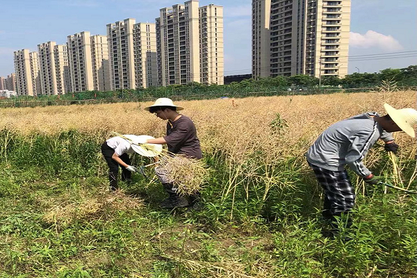 阳光热辣,师生们头带草帽,手拿镰刀,弯腰屈膝,挥洒汗水,认真收割油菜花。实践活动现场,到处是参与师生忙碌的身影,大家合作互助,其乐融融,即使汗流浃背也饱含热情,以激情和担当完成劳动实践活动。