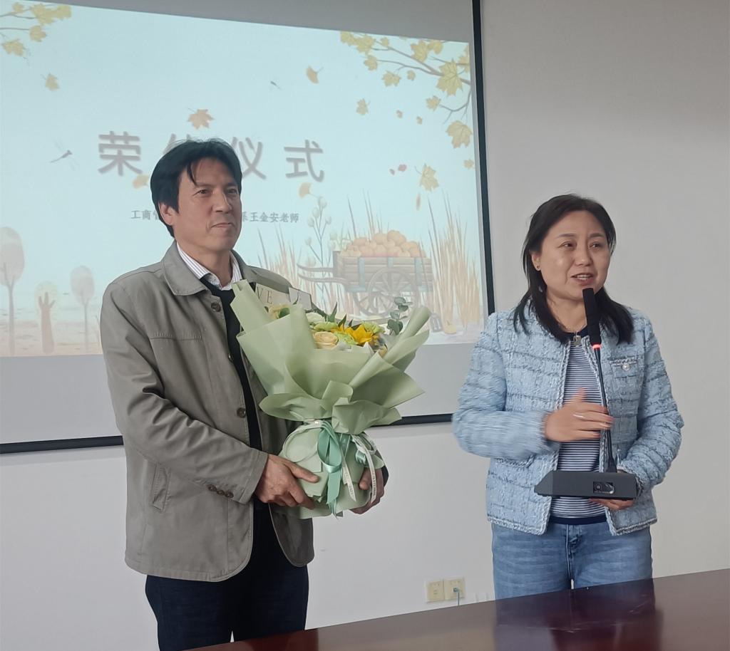 仪式上,韩丽亚代表学院分工会向王金安老师献上鲜花和纪念品,并合影留念。
