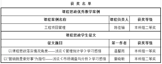 近日,浙江省高等教育学会、浙江省高校课程思政教学改革联盟公布了浙江省高校2021年度课程思政教学改革系列活动评选结果(浙高教学会〔2021〕15号),我院陈佳骊老师荣获课程思政优秀教学案例本科组二等奖,19工商2班温馨雨同学荣获课程思政学生征文本科组一等奖,19市营1班章晓敏同学荣获课程思政学生征文本科组二等奖。