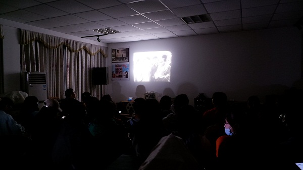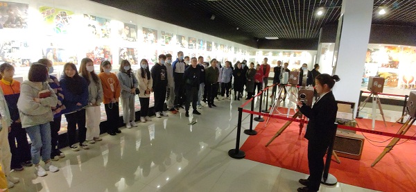 全体师生党员在九斤电影珍藏馆,伴随着广播的解说,大家边走边看,时不时互相讨论,参观馆内新中国电影工业放映史的发展过程。馆内陈列着新中国第一台及之后不断改进的各种型号放映机,大量黑白等电影胶片,新中国电影史上留下永恒记忆的表演艺术家的介绍,还有馆长下农村放映露天电影所用的板车、所骑的自行车、摩托车,件件展品都凝聚了收藏者40年来的心血。