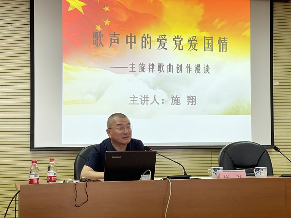 近日,浙财大东方学院邀请诗人、词作家、音乐人、中国音乐文学学会常务理事,具有40年党龄的老党员施翔老师讲授了一堂《歌声中的爱党爱国情》思政课,以迎接中国共产党建党100周年的华诞。在将近三个小时的讲座中,施老师从其优秀作品的创作背景出发,用十二首主题鲜明,风格各异的歌串起了党的恢宏历史和祖国发展壮大的光辉历程,呈现了一堂催人奋进、凝聚信仰的党史教育课。现场气氛庄重激昂,多次响起热烈的掌声,让广大师生在充满了正能量的主旋律曲调中提高了政治站位,增强了思想认同和情感认同。