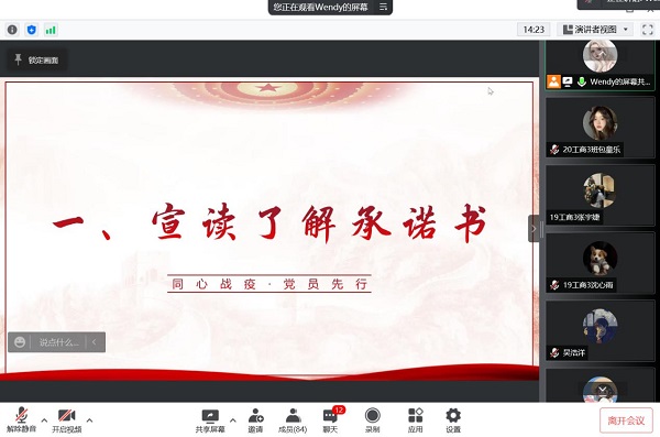 当前疫情形势严峻复杂,周边疫情持续发生,为进一步阻断疫情传播链条,切实保障我院师生的健康,学校决定继续暂停校外外卖进入校园。开会伊始,温馨雨同学就向同学们宣读了《关于选择不点外卖,校内就餐的承诺书》。承诺书倡议全体党员、入党积极分子在校内就餐,行动起来、站好岗、担好责、带好头,共同守护好我们的“东方家园”。