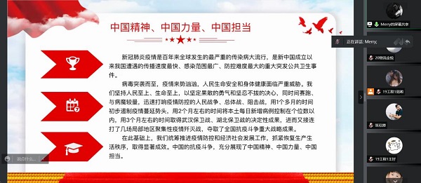 为引导党员同志深刻感悟和弘扬抗疫英雄展现的新时代中国精神,4月22日晚,1946伟德国际源自英国学生第三党支部组织召开了“抗击疫情我带头,线上学习我努力”线上党日活动。党支部书记马硕晨带领支部全体党员共同学习了习近平总书记在全国抗击新冠肺炎疫情表彰大会上重要讲话,交流学习心得。