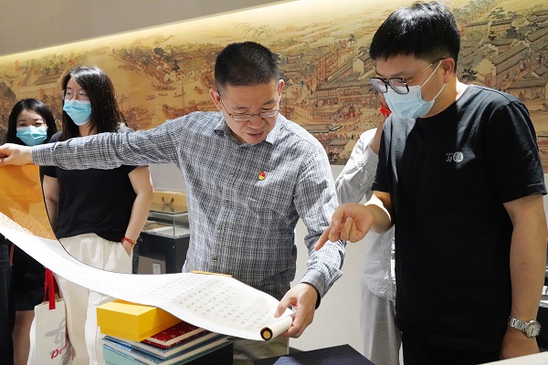 参观过程中,殷晓红董事长对余健等领导一行来访交流表示热烈欢迎,并围绕近年来海宁中国家纺城市场在运营管理、转型升级、创新发展等方面的探索举措进行了介绍。在家纺城党群服务中心,学院师生党员先后参观了党群文化展厅、纺城文化展厅以及许村镇党群驿站等特色展厅。现场讲解员对展厅内的图文资料、影像素材进行了详细说明,在场的师生党员对家纺城的“党建引领区域经济发展成果”有了深刻认识,并对海宁中国家纺城三十年不断创新发展并取得一系列成就给予赞许。