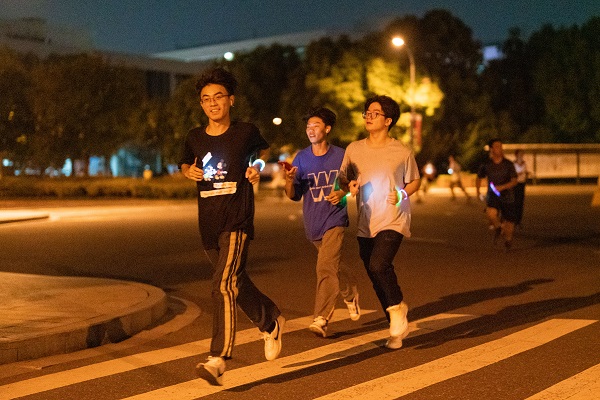 荧光点点,汇聚灿烂星河。伴着一声鸣笛,同学们从小广场领取荧光手环后全力开跑,分别前往五个设置点进行活动打卡并拍照留存。在各个打卡点,大家积极抢答有关党史的题目,并写下对祖国的赞美和大学生活的期望。夜风中,霓虹闪烁,小小纸条在夜色飘动,承载着同学们小小的愿望与美好。荧光图案在夜色中晃动着,留下一道道精彩的奔跑足迹,形成了一缕缕夜色彩虹,为夜晚的东方增添了一道亮丽风景线。