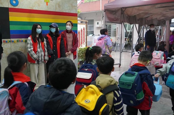 下着小雨,校园门口交通非常拥挤,一群身穿“红马甲”的人便活跃起来,疏导校园门口的车流与人流,为学生们撑伞过马路,志愿者们为学生“护”出了一条平安放学路,成为校园门口一道温暖而亮丽的风景线。